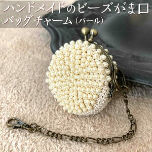 クリームがかったレトロ感漂うパールビーズを編み込んだがま口のバッグチャームです。 金糸の入ったベージュカラーのレース糸を使用しており、とても上品な雰囲気があり、おしゃれな装いにもピッタリです。 金具はアンティークゴール