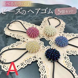 ビーズのヘアゴム5個セットです。 レース糸にビーズを通して編み上げ、クルミボタン金具を編みくるんだモチーフにリングのシリコンゴムを通して作成しました。 3種類のカラーバリエーションがありますのでファッションなどに合わせてカ