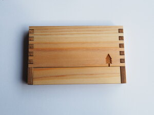 ヒノキを素材とした名刺ケースです。 金具・留め具などを一切使わずに組んでいます。 表蓋をスライドすることで開閉します。 また蓋を開け回転することでケースが自立し、名刺・ショップカードなどをディスプレイすることも出来ます。