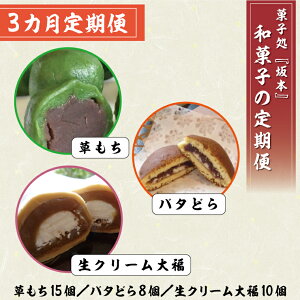 菓子処『坂本』の人気の和菓子セット3種を1ヵ月に1度、3回発送します。 素材の小豆は厳選した北海道産の小豆を使用し、もち米は行方市産の「満月」を使用しています。 生クリーム大福は、生クリーム・苺ミルク・生チョコ・カフ