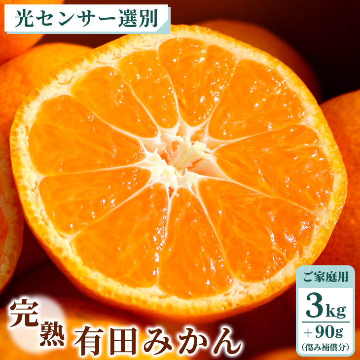 家庭用 完熟有田みかん3kg+90g(傷み補償分)【わけあり・訳あり】【光センサー選果】※北海道・沖縄・離島への配送不可 ※着日指定不可 ※2024年1月上旬〜1月下旬頃に順次発送...