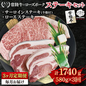 【ふるさと納税】【3ヶ月定期便】【常陸牛 A5ランク・ローズポークステーキセット】常陸牛サーロインステーキ300g+ローズポークロースステーキ280g(140g×2枚) 冷凍 国産...