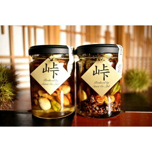 クラッシュしたナッツを蜂蜜の上にふんだんに重ねました。多彩な味わいをお愉しみいただけます。 【La noix au 峠〜朔と宵】小瓶2本/柿渋塗網代箱(紀州塗)入り