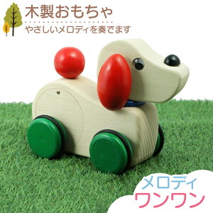 押すとメロディが流れるワンワン。 カラフルなパーツと白木のぬくもり感のコンビネーションがかわいいおもちゃ「メロディワンワン」。木の魅力を生かしたほどよく丸みがかったフォルムが子どもの手によくなじみます。 押したり引いた