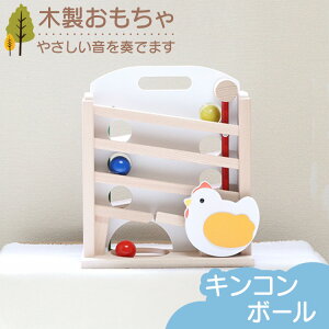 カラー木球をスロープに沿って転がすと鉄パイプに当たって「キンコン」と心地よい音を奏でて、3個の木球がそろうとニワトリさんが”こんにちは”をします。 3個めの球が軽い場合はニワトリさんがお辞儀をしないこともありますので、そ