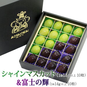 名称 シャイン マスカット・富士の輝 商品説明 甘くて美しい翡翠色のシャインマスカット。「ブラックシャインマスカット」とも呼ばれる富士の輝。それぞれを10粒ずつ、弊社のオリジナルBOXに丁寧にお詰めした特別な20粒です。豊潤な香り