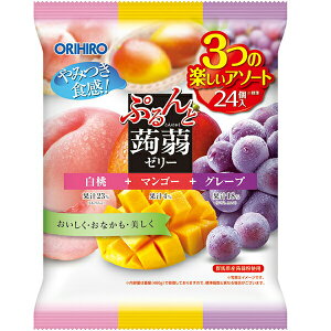 ※パッケージデザイン等は予告なく変更されることがあります。予め御了承下さい。商品特徴 果汁感たっぷりの美味しく手軽なプチサイズの蒟蒻ゼリーです。白桃、マンゴー、グレープの3種類の味が楽しめるお得な大容量24個入り(標準※)