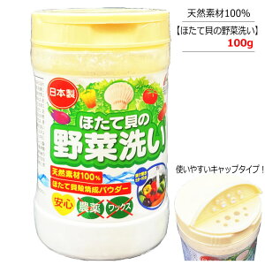 日本製 ホタテ貝の野菜洗い 100g 天然素材100% ほたて貝殻焼成パウダー 北海道産のホタテ貝の粉末を100%使用した天然素材の野菜洗浄剤です。 野菜や果物の漬け置き洗いに。 天然素材100%の洗浄剤ですので...