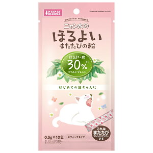 刺激が少なめがいい猫ちゃんにも。 猫ちゃんとのコミュニケーションに最適。 ごほうび、毎日の健康維持に! (ほろよい度数50% レギュラーブレンド) 容量: 0.5gx10包 規格: 【原材料】 またたび...