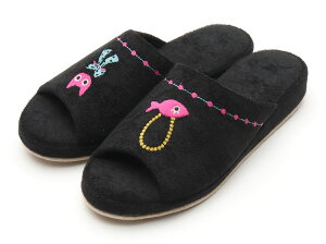 黒猫MEMEとかわいい小物を刺繍で描いたパイル地のスリッパ。約3cmの少し高めのヒールに高反発ウレタンが入ったソールで足にフィットします。 【素材】ポリエステル、ポリエステルスウェード 【適応サイズ】約23〜24cm 【生産国】中国