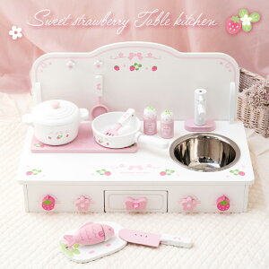 可愛い卓上ままごとキッチンです。 背板部分はリバーシブル、天板は2種類(野いちごと木目調) かわいいきらきらいちごデサインキッチンと時計が付いたキッチン お鍋を乗せるとコンロからお料理の音がします 【セット内容】キッチン本