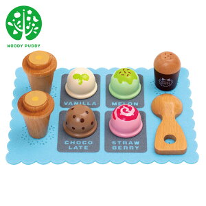 メーカー:DJECO(ジェコ) ・対象年齢:4歳〜 ・材質:木、フェルト ・生産国:中国 ・商品内容:アイスクリーム×6、コーン×2、ディッシャー×1、メニュー×1個、フタ×1