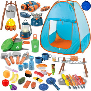 【超豪華、大量セット】 キッズテント キャンプセット です。ランタンや焚火など、結構本格的なものもあり、食材やギア類とパーツが豊富にあります。テントのサイズは80×80×90なので、で室内で遊ぶには丁度良いサイズです...