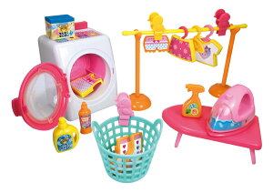 洗濯機に洗濯カゴ、洗剤、アイロンやアイロン台、ハンガーに洗濯バサミ、物干し竿まで付いて洗濯ごっこを楽しめるお洗濯セットです! 洗濯機は電池不要なのに、ボタンを押すとドラムが回ります☆ パッケージサイズ:H235×W220×D95mm
