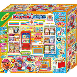 アンパンマンとコンビニごっこしよう! ほんものみたいな16種類の商品をいっぱい棚に並べてね♪セルフレジでいっぱいスキャン! 電子レンジであたためて♪スマートフォンとカードでスマートにおかいものが楽しめるよ♪