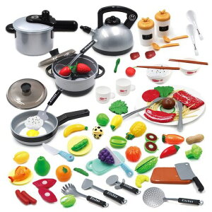 【豪華84点セット内容】食材種類が豊富で、楽しく遊びながら食育を!本物の食物のように、果物、野菜、揚げた料理、調理器具、圧力鍋、お鍋、フライパン、ケットル、食パン、飲み物、などいろいろあります。日常生活やダイニングシーン