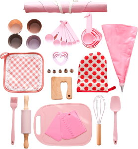 【セット内容】エプロン*1、泡立て器*1、スパチュラ*1、断熱手袋*1、ブラシ*1、幼児用ナイフ*1、計量カップ*5、装飾用ヘラ*3、計量スプーン*6、麺棒*1、断熱マット*1、絞り袋*1、絞り口金*6、マフィンカップ*4、まな板*1...