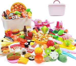 【豪華84点セット内容】食材種類が豊富で、楽しく遊びながら食育を!本物の食物のように、果物、野菜、揚げた料理、調理器具、圧力鍋、お鍋、フライパン、ケットル、食パン、飲み物、などいろいろあります。日常生活やダイニングシー