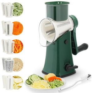 【5-in-1野菜スライサー】簡単に付け替えが可能な5枚ステンレスブレードドラム(スライス/細切り/粗切り/波形スライス/すり下ろし)、手回し式の野菜スライサーのデザイン、指の怪我を防ぐ安全ブラケット、野菜スライサーの底にも滑り止めが