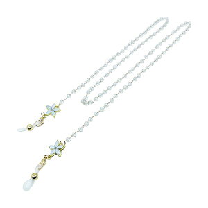 5mmの小粒パールを使用したネックレスにもなる眼鏡チェーンです。 ご使用の眼鏡に簡単に装着することができ、眼鏡の付け外しがラクになるアイテムです。 小粒なパールが上品なデザインとなっておりますので、眼鏡チェーン初心者の方に