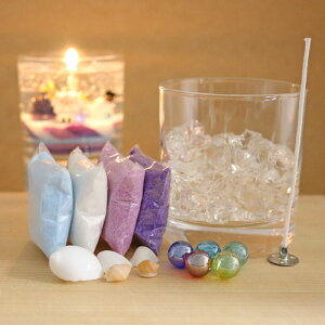 *セット内容* グラス1個 キャンドル用芯1本 カラーサンド4色(スカイブルー、ホワイト、ラベンダー、バイオレット)各30g ビー玉 5色 貝殻 5個 キャンドル用クリアジェル 100g 作り方説明書付き...