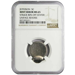 Jefferson 5c Mint Error Struck 80% Off Center Uniface Reverse MS65 NGC Brown ...商品について認証:NGC流通/非流通コイン:ジェファーソン・ニッケル組成:...