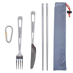 フォーク:約164x22x2mm、12g; ナイフ:約185x16x2mm、15g; 箸:約230mm、15g角箸3点セット 総重量:約47g。付属にチタン合金製カラビナが付きます。チタンの金属の影響...
