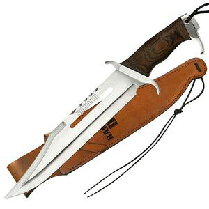 ランボーナイフ サバイバルナイフランボーシリーズ第一作目で使用されたボウイナイフのレプリカ1985年公開のランボーシリーズの第一作目でシルベスタースタローン扮するランボーが使用したサバイバルナイフのレプリカ。劇中に登場する