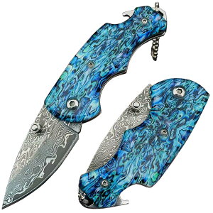 商品情報商品の説明主な仕様 【仕様】サイズ:全長約135mm/刃長約50mm/刃幅約26mm/刃厚約2.5mm。収納後約85mm。材質:67層ダマスカス鋼、エポキシ樹脂。重量:約80g。色:ブルー。【特徴】片手オープンをサポートする外...