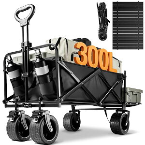 キャリーワゴン 【300L大容量 長物対応 後部展開可 耐荷重250kg】 キャリーカート テーブル付き ボトルポケット付き アウトドアワゴン キャンプ 折りたたみ ワンタッチ収束式 軽量 静音 キャンプ...