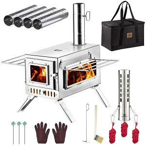 薪ストーブ AVOFOREST 折り畳み式 キャンプ用ストーブ ステンレス製 2面の耐熱ガラス グリッド棚 煙突 スパークアレスター付き コンパクト収納 収納袋付き テント調理 バーベキュー BBQ 焚き火...