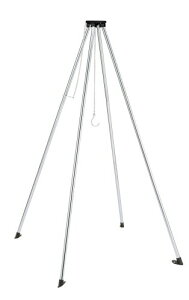 焚き火をグレードアップする 安定性抜群の4本脚スタンド。焚き火台とファイアープレイステーブルを組み合わせて囲炉裏風に。荷重により固定されるストッパーでチェーンの長さ調節も簡単。地面にペグダウンできるループとペグ付き。