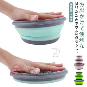 お出かけで便利な折りたたみボウル3点セット。持ち運びに便利な折りたたみ式ボウルです。 シリコン製なので、とても丈夫で軽いから持ち運び楽々です。 折りたたみカップなのでアウトドアやレジャーでもバッチリ!...