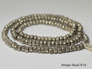 タイ北部やビルマの山村に暮らす山岳少数民族カレン族が作る、刻印が施された扁平丸型シルバービーズ一連です。ホワイトハート等のアクセサリーのワンポイントとして使うと、アクセサリーが一層引き立ちます。粒の大きさや孔径には若