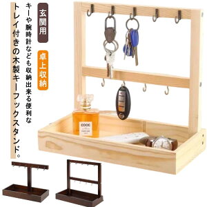 キーや腕時計なども収納出来る便利なトレイ付きの木製キーフックスタンド。スリムでシンプルなデザインだから玄関やリビングなど、置き場所に困りません。段違いの2段式フックだから上段には鍵、下段には腕時計など、種類によって使い