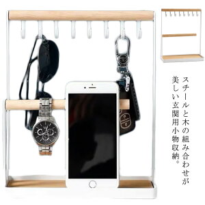 スチールと木の組み合わせが美しい玄関用小物収納。鍵、車のスマートキー、腕時計、ブレスレットなどを掛けられる便利な収納スタンドです。下のトレーにはメガネや指輪などが収納でき、オシャレでありながら利便性も良く使いやすい...