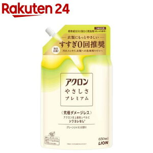 ▼5400円以上送料無料 (但し沖縄県、離島などは別途送料負担があります) ライオン アクロンやさしさプレミアム グリーンシトラスの香り つめかえ用650mlは洗濯工程の7割を占め、衣類ダメージの原因である「すすぎ」をな