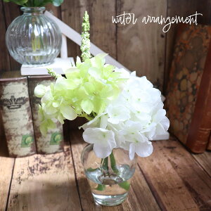 グリーン・ホワイトのアーティフィシャルフラワー(造花)のあじさいをガラスベースに入れたマジカルウォーターアレンジです。 マジカルウォーターは、透明度が高いので見た目は本物のお水に花を挿しているようですが、お水は固まって