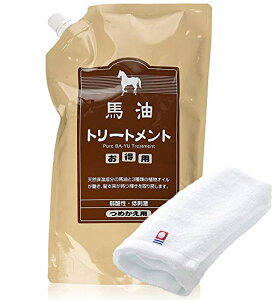 馬油トリートメントの詰替え用1000mlと、今治タオル ウォッシュタオル1枚(素材:綿100%)旅館ホテルでおなじみアズマ商事の馬油シリーズ(天然保湿成分馬油配合)タオルサイズ:28cm×28cm(今治タオル認定番号41