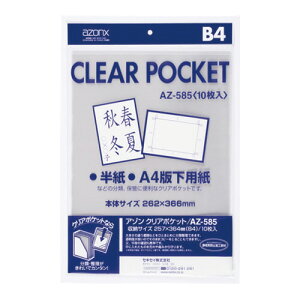 ●B4サイズ・フタなしのクリアポケット10枚入です。●入口を片面5mm下げていますから中身が取り出しやすく便利です。●透明だから中身がすぐわかる。●静電気防止加工で書類が張り付かず、出し入れもスムーズ。●サイズ/B4●色/透明●