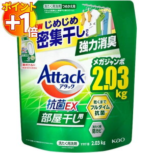 花王 アタック抗菌EX部屋干し用 つめかえ2.03kgは高湿度90%の密集干しでも天日干し級に強力消臭。乾くまでフルタイム抗菌洗たく槽防カビ外干しにも使えます。柔軟剤・衣料用漂白剤(酸素系)も使えます...