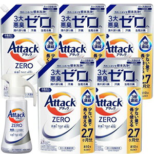 内容/ アタックZERO 400g×1本 アタックZERO 詰め替え用 810g×5袋 箱寸/15×24×33cm ゼロ洗浄で、落ちにくい汚れ・生乾き臭・洗剤残りゼロへ。洗うほど衣類がよみがえります。