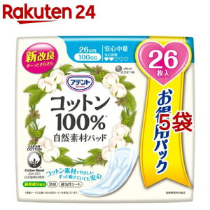 トイレ用品>軽失禁対策>軽失禁パッド・パンツセット>アテント コットン100% 自然素材パッド 安心中量 大容量パック (26枚入*5袋セット)【アテント コットン100% 自然素材パッド 安心中量 大容量パック