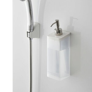 マグネットが付く浴室壁面に簡単取り付けのディスペンサーボトル。そのままポンプを押して液体を出せます。蓋が外れるのでお手入れや注ぐのが簡単。詰め替え用袋がそのまま入ります。