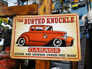 ムーンのカスタムショーなんかで見かけるホットロッドカーをセンスあるイラストで描いて看板にしたバステッドナックルガレージのヘヴィースチールサインです。 このままア