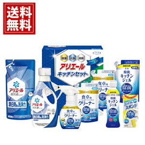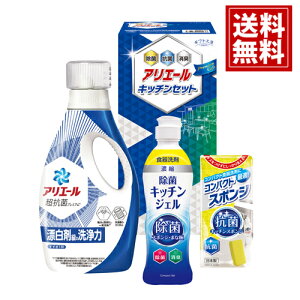 【商品詳細】洗剤アリエールと、少量でたくさん洗える濃縮タイプの食器洗剤除菌ジェル、室内干しのイヤなニオイを防ぎ、ふっくら柔らかく仕上がる・消臭ソフターのギフトです。現品サイズ・内容:720gアリエールジェル・200ml除菌キッチン