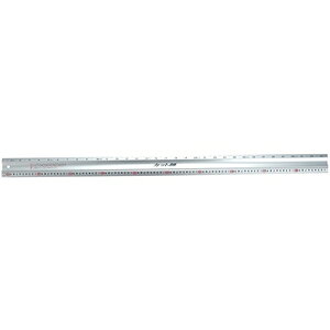 【用途】長さ測定・線引き・カッティング・丸ノコガイド定規。【機能・特徴】大きく鮮明な目盛数字を採用しています。カッター面に刃が食い込まないよう、ステン鋼を貼り付けてあります。定規を固定しやすくするように裏面にスベリ止
