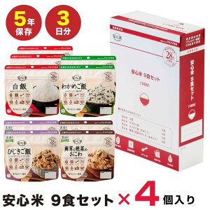※こちらの商品は返品交換一切不可商品となります。 名称: 長期保存食セット アルファ化米飯 安心米 9食×4個セット 原料原産地: 安心米(白飯):(うるち米)国産 安心米(わかめご飯):(うるち米)国産、(わかめ)韓国 安心米(舞