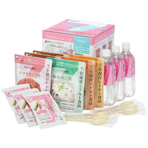 レトルト米粉クッキー×3、レトルト食品(カレーピラフ・トマトリゾット・五目ご飯×各1、各食230g、スプーン付)、レトルト米粉パン(プレーン・ストロベリー・ココア×各1)。保存水(硬度0、500ml)3本。
