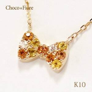 リボン パヴェ ネックレス K10YG オレンジサファイア イエローサファイア ホワイトサファイア リボン パヴェ ペンダント ネックレス カラーストーン ribbon necklace 地金品質 K...